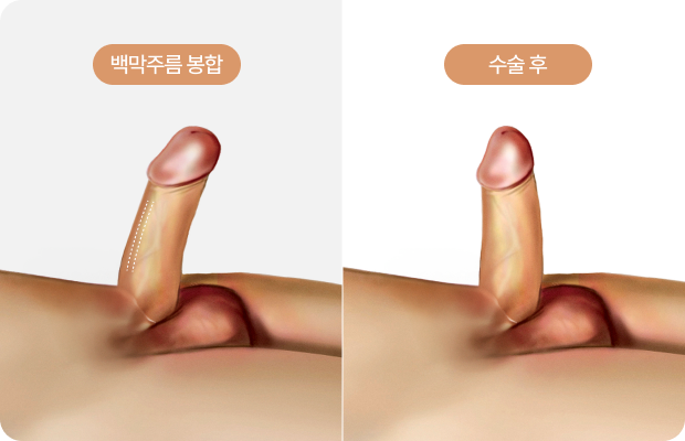 만곡 각도가 일정 수준 이상이거나 성관계에 지장을 줄 정도로 휘어 있는 경우 수술적 교정을 고려합니다. 백막봉합법은 휘어진 반대편 해면체 백막을 봉합하여 길이의 균형을 맞추는 방식입니다. 짧은 쪽을 늘리는 것이 아니라 긴 쪽을 줄여 각도를 바로잡는 원리입니다. 구조적 단순성과 안정성이 장점이며 발기 기능을 보존하면서 교정하는 것이 목표입니다. 다만 일부 길이 감소가 체감될 수 있어 수술 전 충분한 설명이 필요합니다.