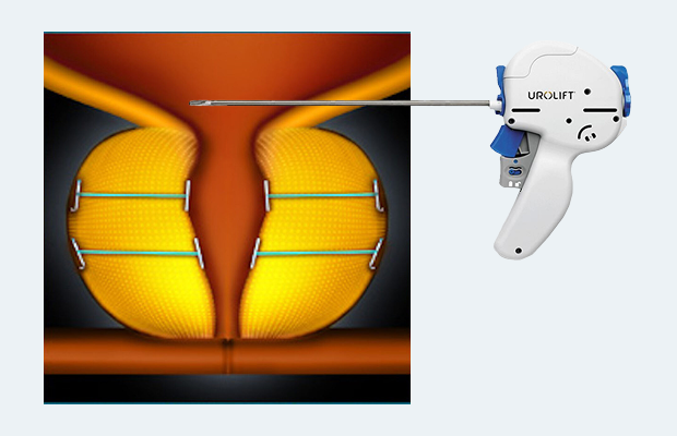 요도 양측 비대 조직에 미세 임플란트를 삽입하여 조직을 고정합니다.